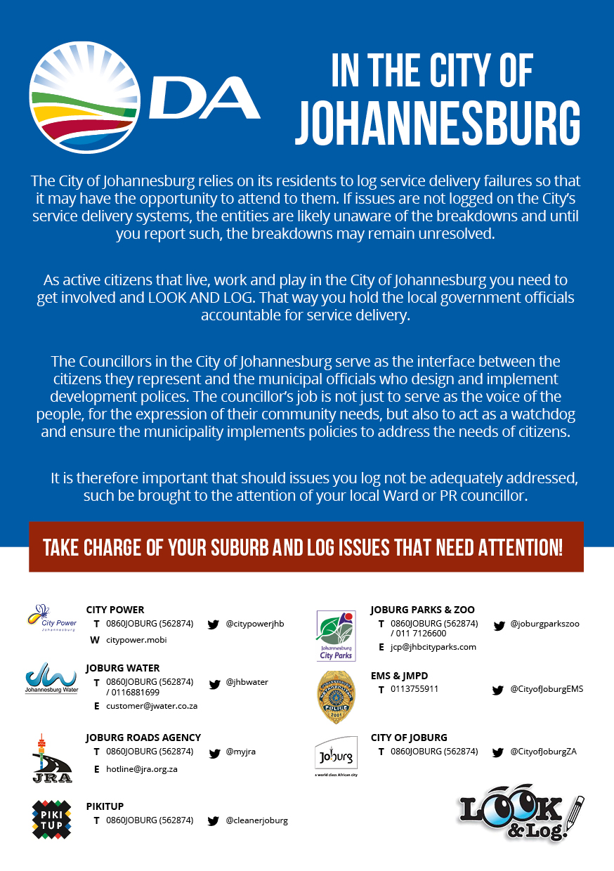 In 2015, the DA released a look and log guide for the City of Johannesburg. Whilst not an official publication by the City, it is an adapted log guide for residents of the City.